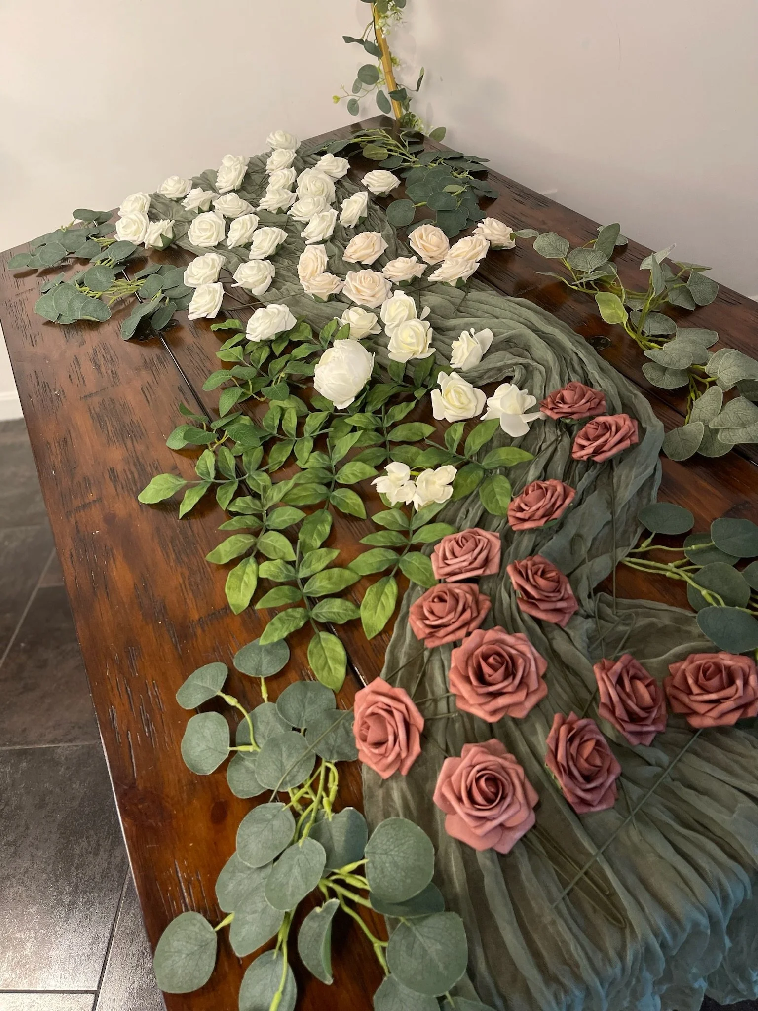 25 White, 9 Cream & 12 Mauve Wire Stemmed Roses with Eucalyptus Branches and other Foliage